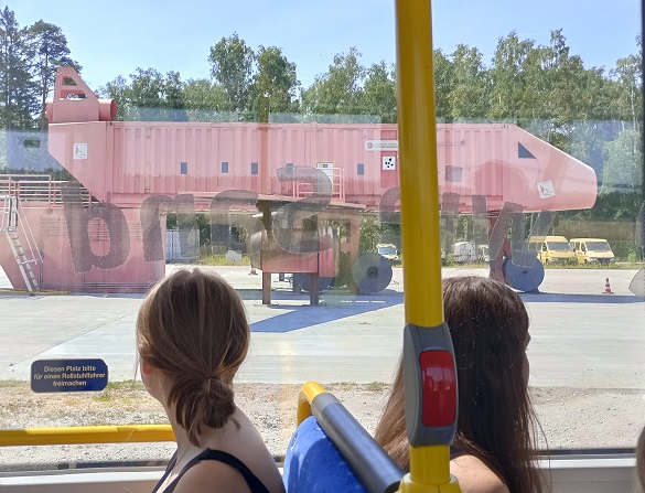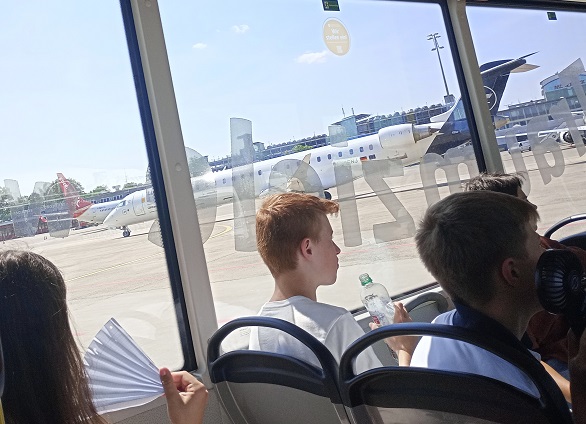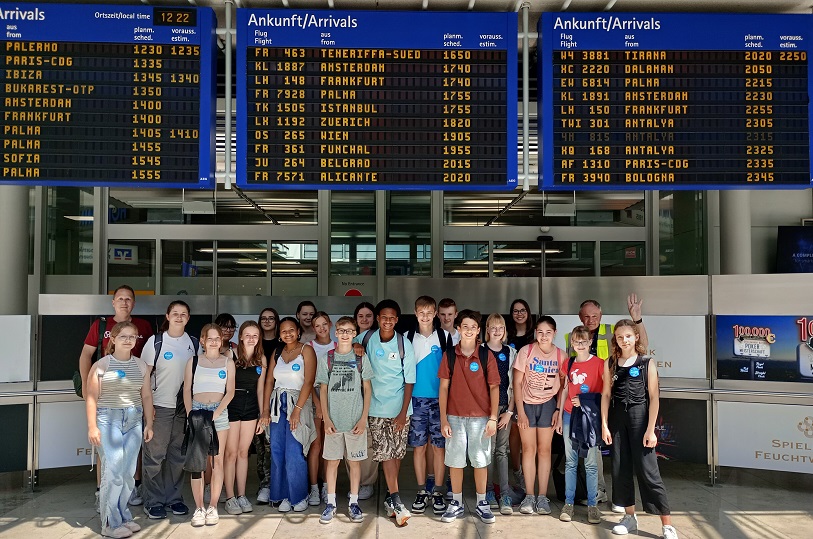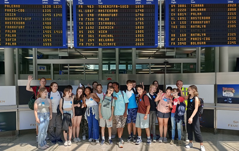 Am 26. Juni 2023 trafen sich die Siebtklässler des bilingualen Geographiekurses morgens am Bayreuther Hauptbahnhof mit den Geographielehrern Frau Turban und Herr Leiber – per Regionalexpress ging es zunächst in die Nürnberger Innenstadt, wo am Hauptmarkt ein kühlendes Eis auf alle wartete. Anschließend brachte die U-Bahn die Exkursionsteilnehmer zum Albrecht-Dürer Airport in Nürnberg. Im Geographieunterricht hatten sich die Schüler im Laufe des Schuljahres intensiv mit der europäischen Firma Airbus beschäftigt, u. a. wurde gelernt, wie ein Flugzeug entsteht und an welchen europäischen Standorten Airbus produziert. Die Klasse wurde am Airport von Dieter, dem Tourguide, freundlich empfangen und durch die Sicherheitskontrollen auf das Rollfeld geführt, wo alle in einem Bus Platz nehmen durften. Kurt, der Busfahrer, navigierte den Bus möglichst nah an die Flugzeuge, sodass Maschinen der Fluggesellschaften Turkish Airlines, KLM, Ryan Air, Lufthansa, Swiss, British Airways, Air France und Corendon beim Landen, Be- und Entladen sowie Abheben aus direkter Nähe beobachtet werden konnten. Zu den Highlights der Flughafentour zählten sicherlich das Landen des „FCN-Fliegers“ von Corendon, die Besichtigung des Fuhrparks der Flughafenfeuerwehr mit Flugzeugdummy, an dem das Löschen eines brennenden Flugzeugs geübt werden kann, und das Fahren auf der extra für die Klasse beleuchteten Start- und Landebahn (trotz Vollgas blieb der Bus jedoch am Boden!). Mit vielen neuen Informationen und spektakulären Momenten im Kopf ging es anschließend mit U-Bahn und Regionalexpress wieder zurück nach Bayreuth – ein fliegend schöner Schultag!