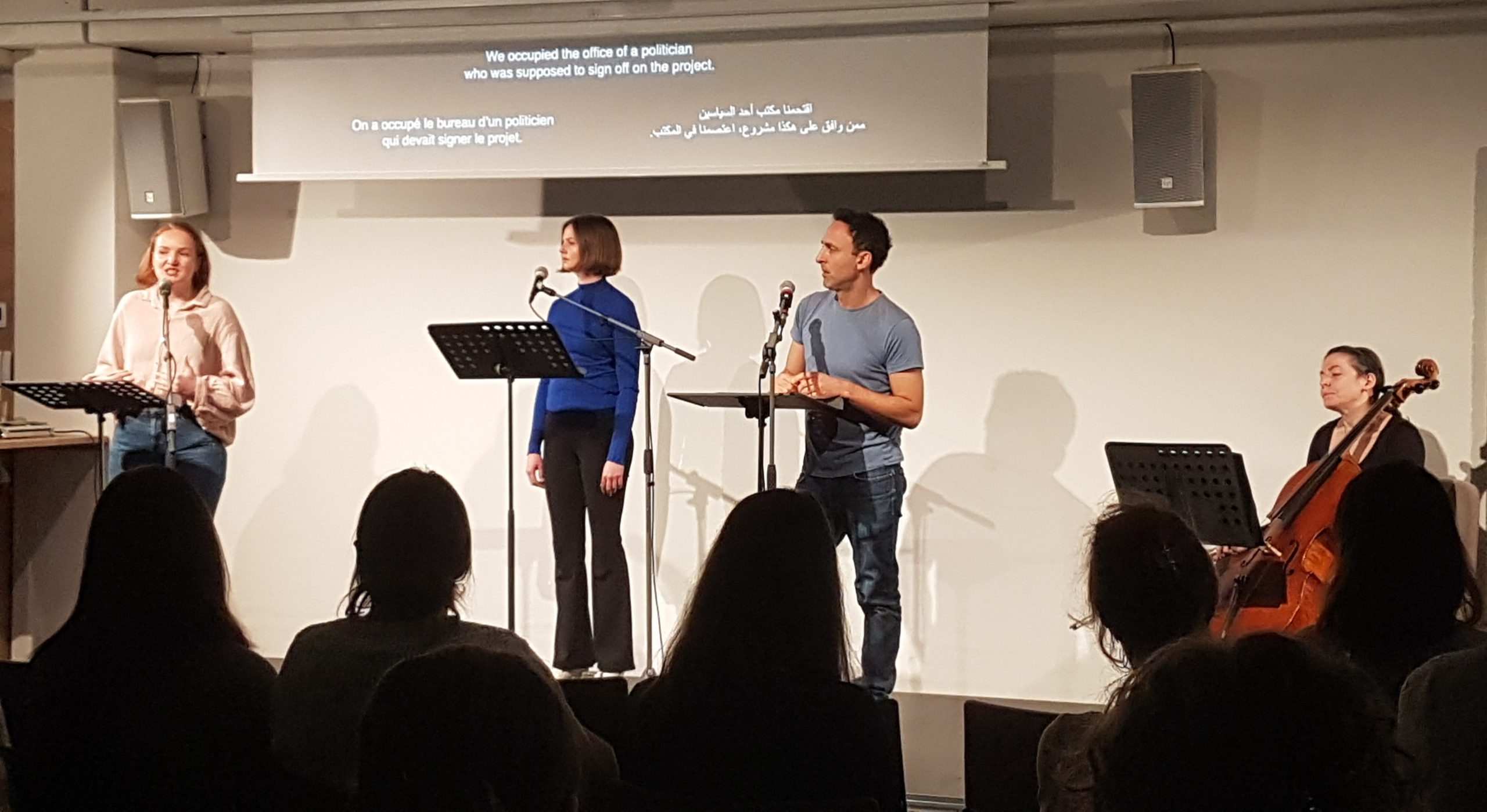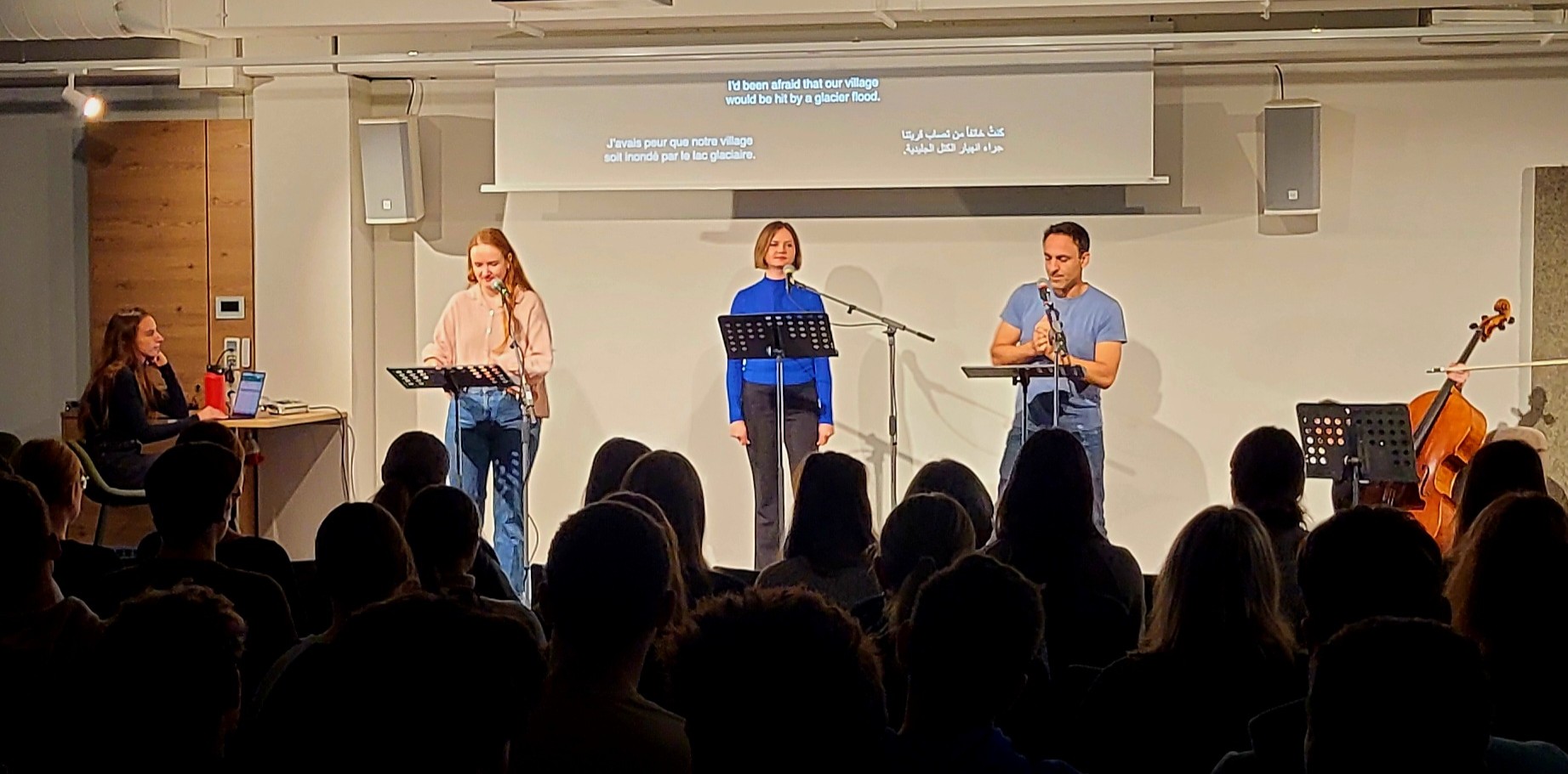 Das 45-minütige dokumentarische Theaterstück „Klima-Monologe“ erzählte von den weltweiten Kämpfen verschiedenster Menschen gegen den Klimawandel. Sie gaben Einblick, wie Daniyal aus Pakistan und Leigh-Ann aus den USA ganz konkret die Folgen des Klimawandels in ihren eigenen Biografien spüren, wobei die mitreißenden Monologe mit Live-Musik untermalt wurden. Die direkt anschließenden, interaktiven Workshops, gehalten von Referenten der Organisation „Peace Brigades“, ermöglichten ein emotionales Verständnis der Klimakrise und ein Reflektieren von Fragen zur Klimagerechtigkeit.