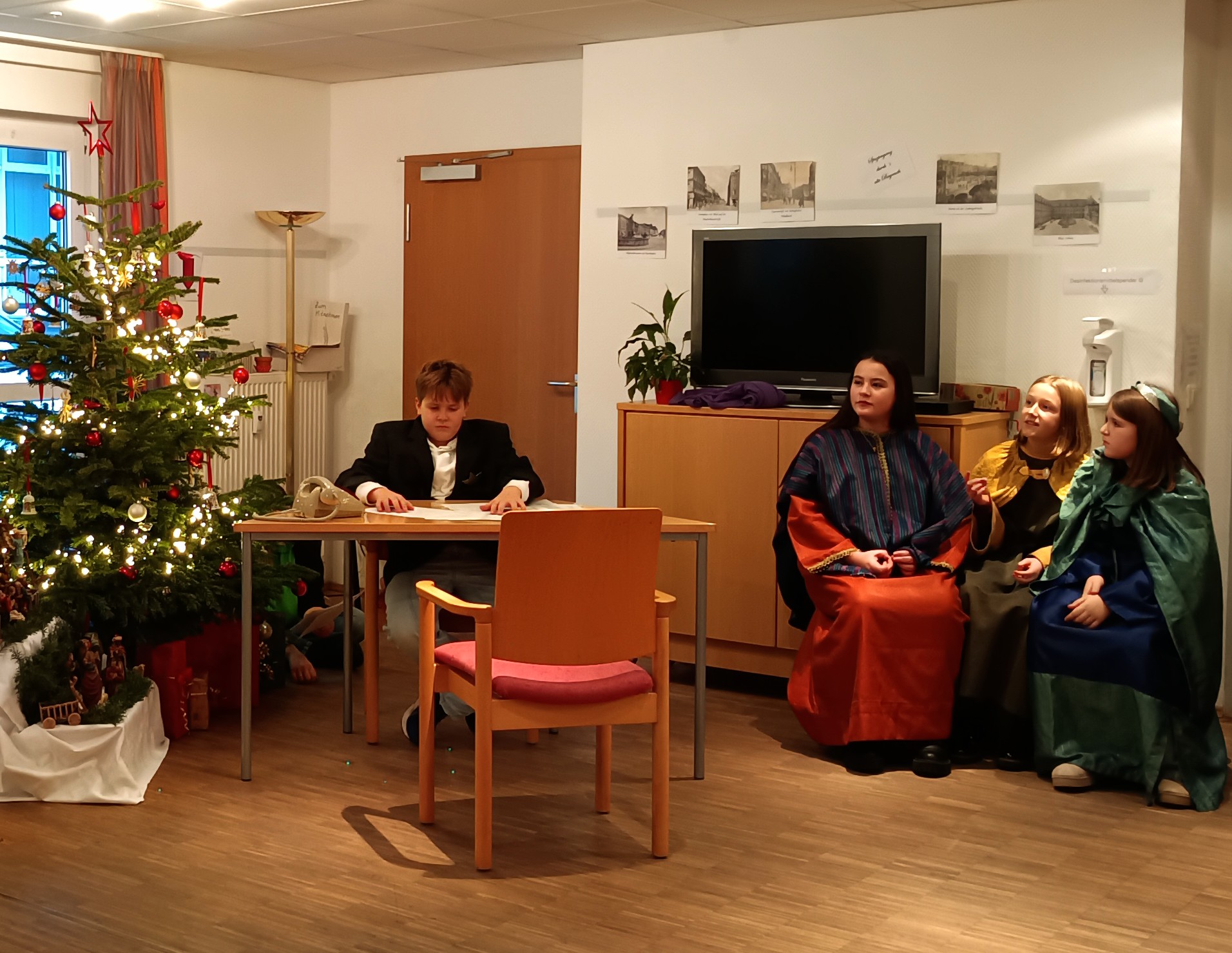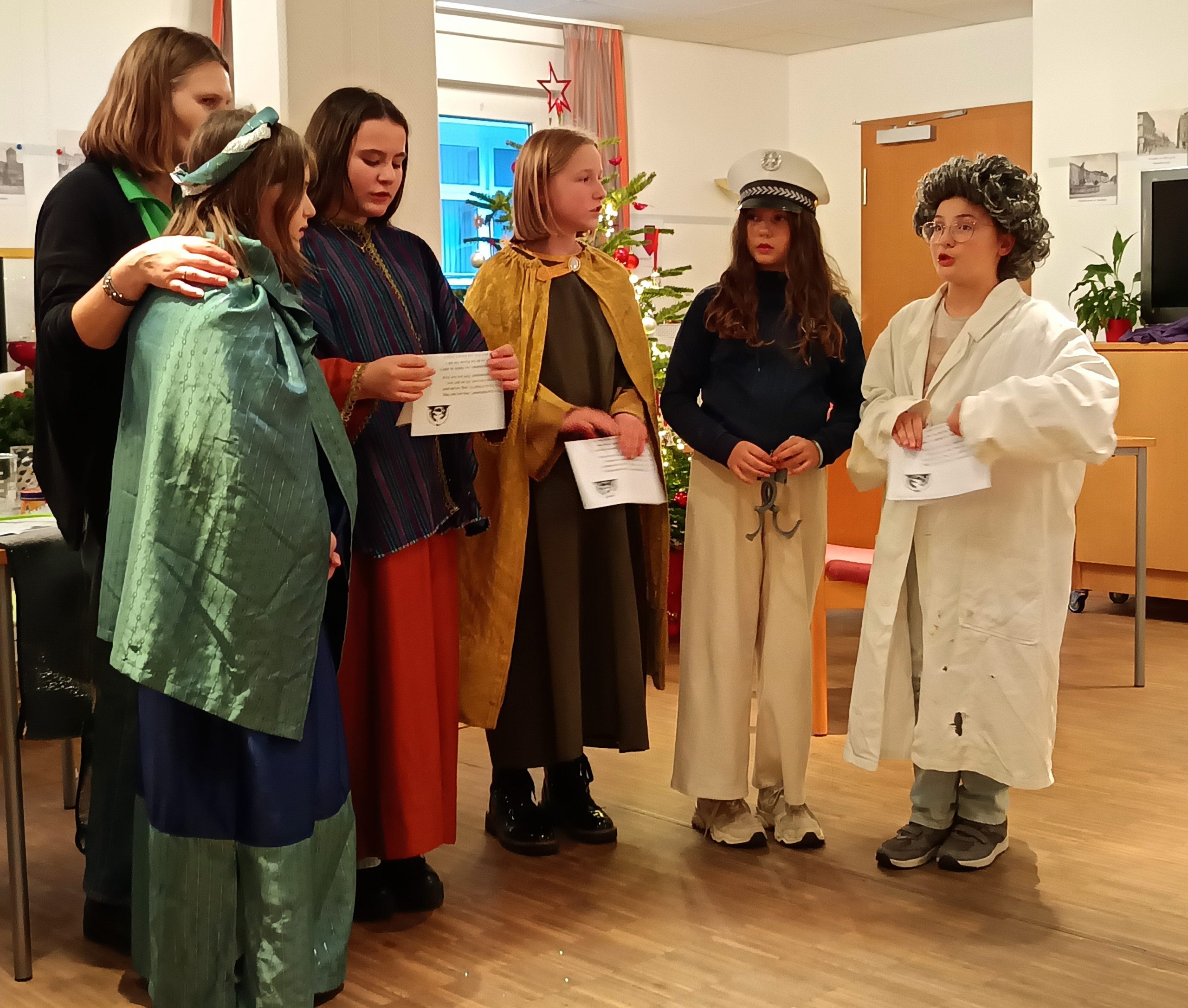 Die Theatergruppe der Unterstufe hatte – passend zur Weihnachtszeit – ein kurzes Stück einstudiert, in dem die Sterndeuter aus der Zeit Jesu auf einen Kommissar unserer Tage treffen. Dieser kann mit ihren Anliegen zunächst gar nichts anfangen, schließlich wird er aber doch nachdenklich: „So ein Stern, der Erlösung ankündigt, der wäre schon ein Glück für uns …“