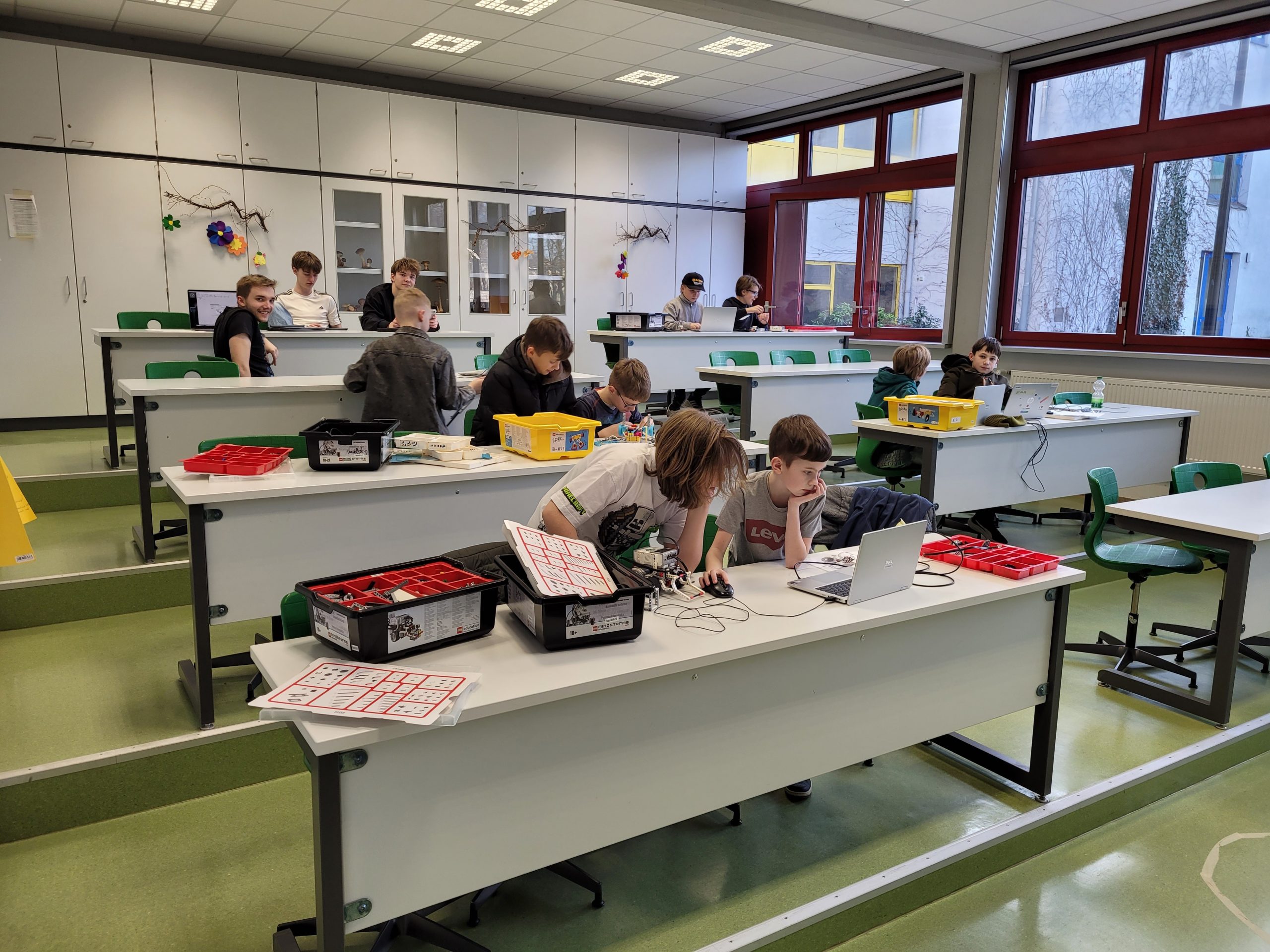Am 6. und 7. März verwandelte sich das WWG erneut in eine lebendige Werkstatt voller Ideen, Technik und Teamgeist: 15 Schülerinnen und Schüler der Klassen 5 bis 7 trafen sich zur diesjährigen „Langen Nacht der Roboter“, um sich intensiv auf den WRO‑Roboterwettbewerb am 4. Mai in Bayreuth vorzubereiten. Unterstützt wurden sie von vier engagierten Betreuern aus den Klassen 11 und 12 sowie dem besonderen Gast Manuel Selch, einem ehemaligen Schüler und langjährigen Robotik‑Teilnehmer, der extra aus München angereist war, um die Teams zu unterstützen.