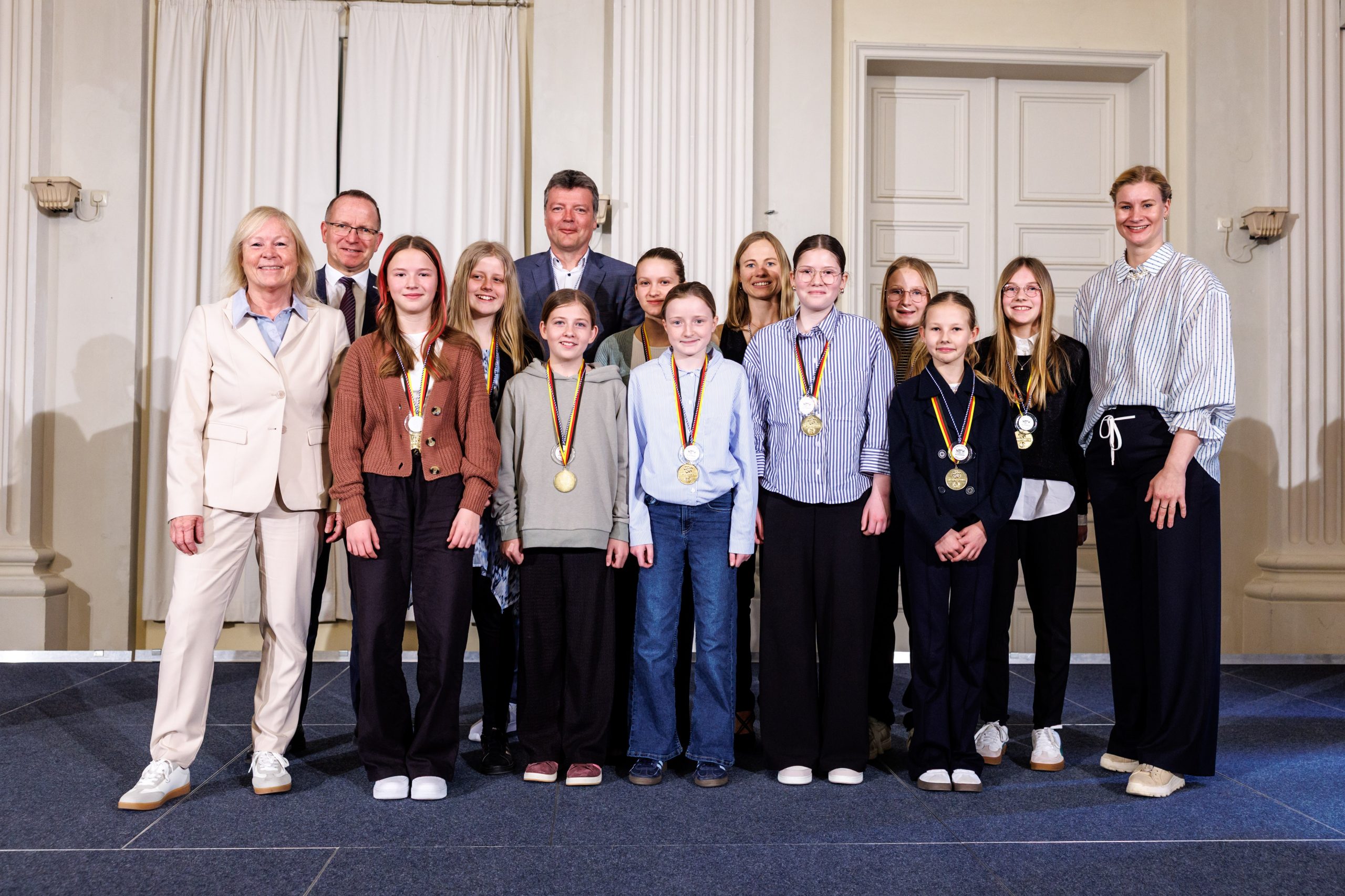 Besondere Ehre für die Fußball-Schulmannschaft des WWG. Durch ihre herausragenden Erfolge bei Jugend trainiert für Olympia und den 3. Platz bei den deutschen Meisterschaften in der Altersklasse IV erhielten die von Kathrin Krämer trainierten Mädchen am Mittwoch, 25.3.26, in einer Feierstunde in der Residenz München von Kultusministerin Anna Stolz und Rodelolympiasiegerin Dajana Eitberger die bayrische Schulsportmedaille verliehen.