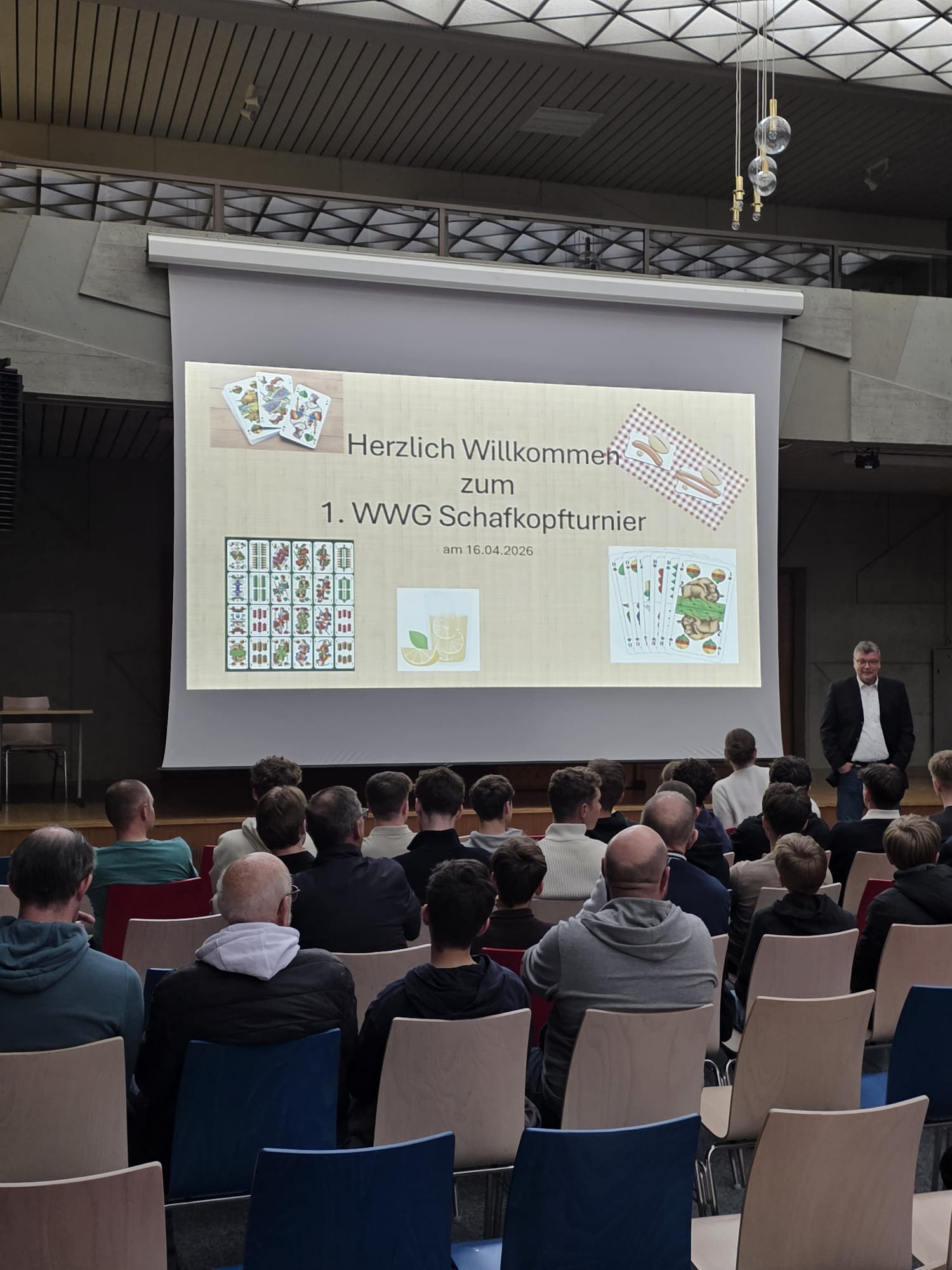 Am 16. April 2026 fand am WWG erstmals ein Schafkopfturnier statt, das sich bereits im Vorfeld großer Beliebtheit erfreute. Trotz auf 56 Spielplätze begrenzter Teilnehmerzahl – gespielt wurde an 14 Tischen – lagen deutlich mehr Anmeldungen vor, was das große Interesse an diesem traditionellen Kartenspiel unterstrich.